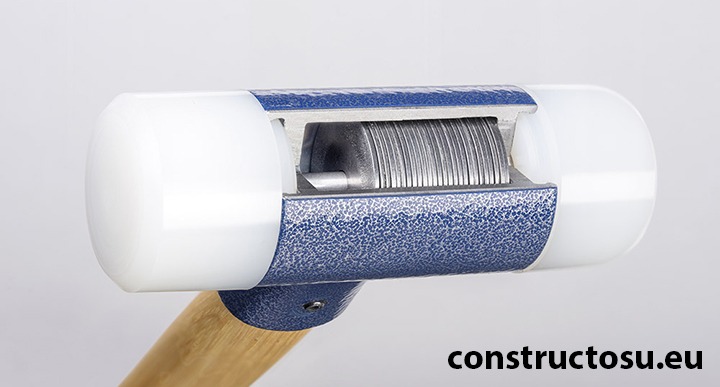 Cu acest design, lucrul mecanic efectuat asupra pilonului vine în două etape. Prima dată, lovește carcasa ciocanului și cu placa de contact, iar o fracțiune de secundă mai târziu urmează să vină și discurile din interiorul ciocanului. Astfel voi limita forțele asupra pilonului, a plăcii de contact, dar și asupra întregului ansamblu. Este aceeași forță. Doar că vine în două etape, iar al doilea impact se întâmplă înăuntru și nu mai face chiar așa de mult zgomot. Impactul se va resimți mai puțin și la vecini.